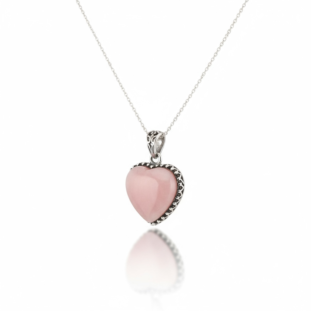 A delicate pendant featuring Pink Opal gemstone, framed in 925 sterling silver. The stone’s soft pink hues are beautifully showcased in a charming heart shape, creating a piece that is both romantic and timeless. Expertly crafted, this pendant blends delicate charm with refined craftsmanship, making it a treasured addition for collectors and gemstone jewelry lovers.