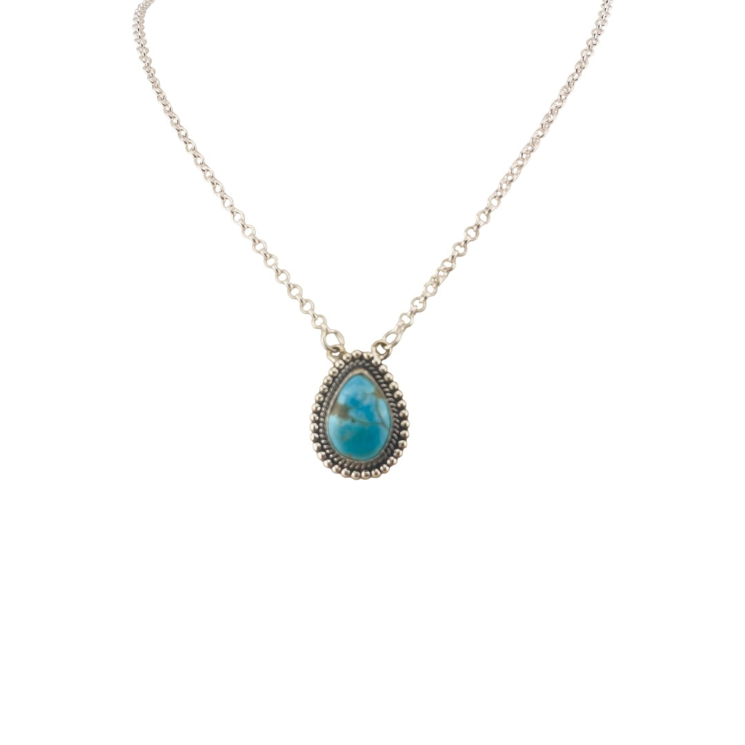 A stunning pear shaped Blue Turquoise gemstone is framed in 925 sterling silver and suspended on an 18-inch adjustable sterling silver chain. The stone’s vibrant blue hues with natural matrix patterns are beautifully showcased, creating a bold and captivating necklace. Expertly crafted, this piece combines natural charm with refined workmanship, perfect for anyone who loves unique gemstone jewelry.