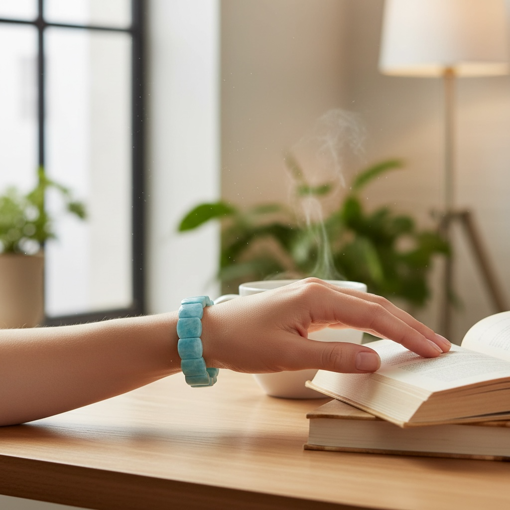 This bracelet features Larimar in soothing Caribbean blue tones. Each rectangular piece shows a blend of sky blue and gentle white marbling that Larimar is known for. The polished finish highlights the stone’s natural patterns and calming appearance. Each piece measures approximately 13–14 mm, and the bracelet is 7 inches with a comfortable stretch fit for everyday wear.