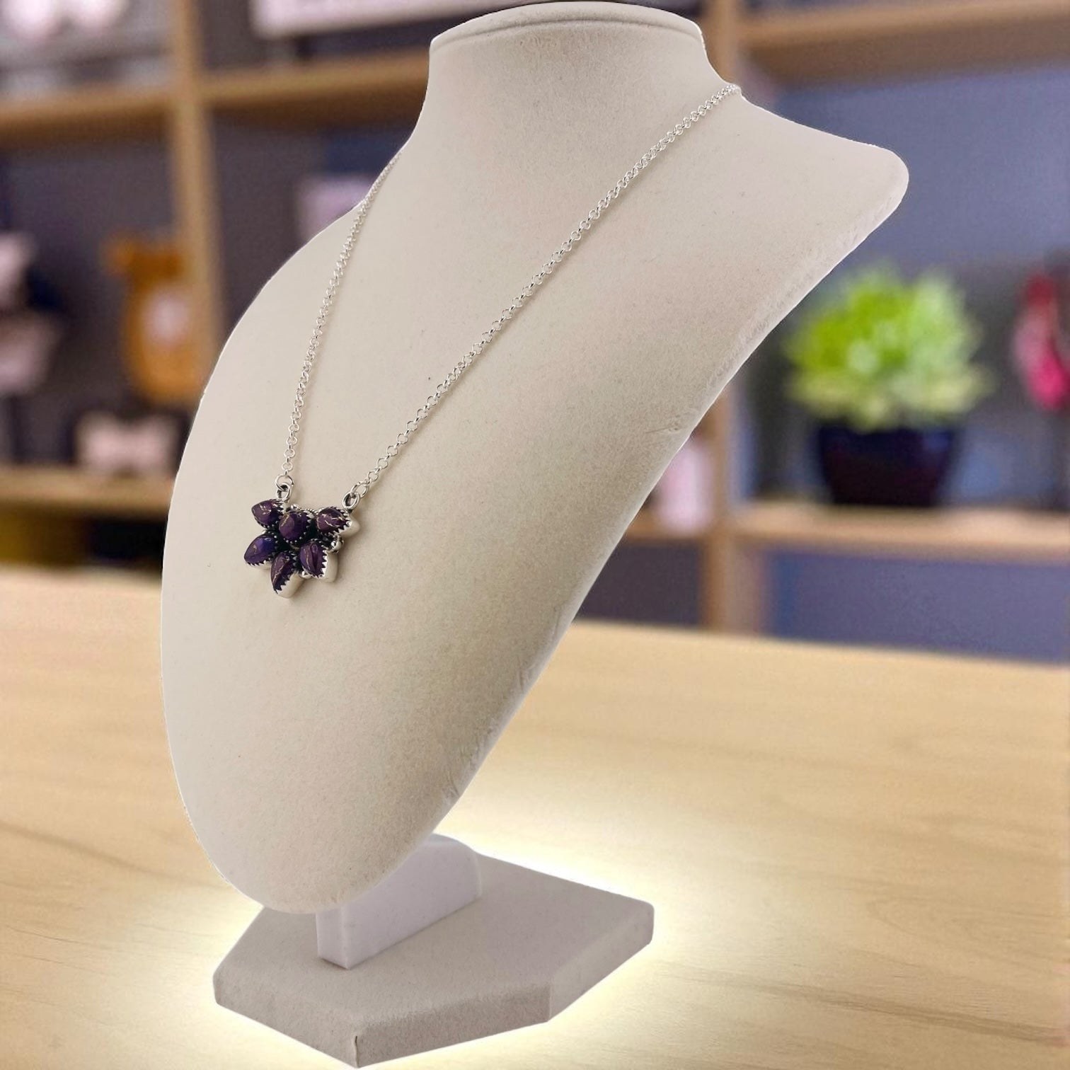 The Timeless Cluster Necklace with Purple Dahlia is a true statement of elegance. This sterling 925 silver design highlights a cluster of Purple Dahlia stones, celebrated for their striking mix of hues and bold veining. The necklace is crafted with a sterling silver chain and secured with a sturdy lobster clasp. Its adjustable chain allows for a comfortable and versatile fit, making it perfect for layering or wearing on its own. Whether worn as an everyday accessory or gifted for a special occasion, this necklace adds sophistication and timeless style to any look.
